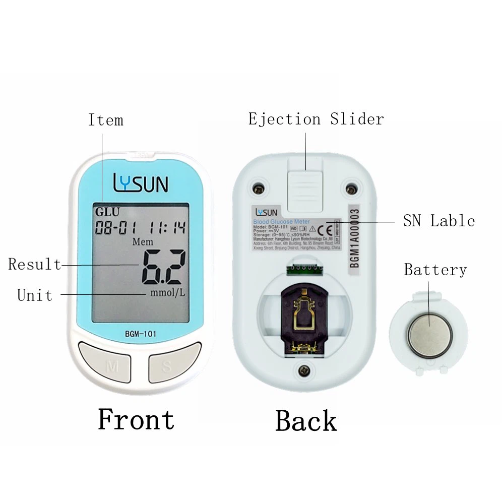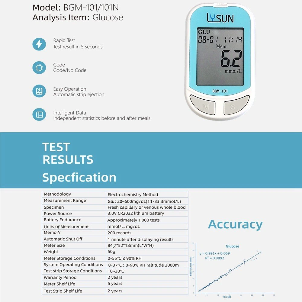 Principales caractéristiques du système de surveillance de la glycémie• Bandelette de test conçue par siphon de pré-aspiration, facile et pratique à utiliser• Petit échantillon de sang de 1 μL• Temps de mesure rapide 5-seconde• Grand écran LCD facile à lire• Automatique 7, 14 et 28 jours moyennes • Stockez jusqu'à 200 résultats avec date et heure