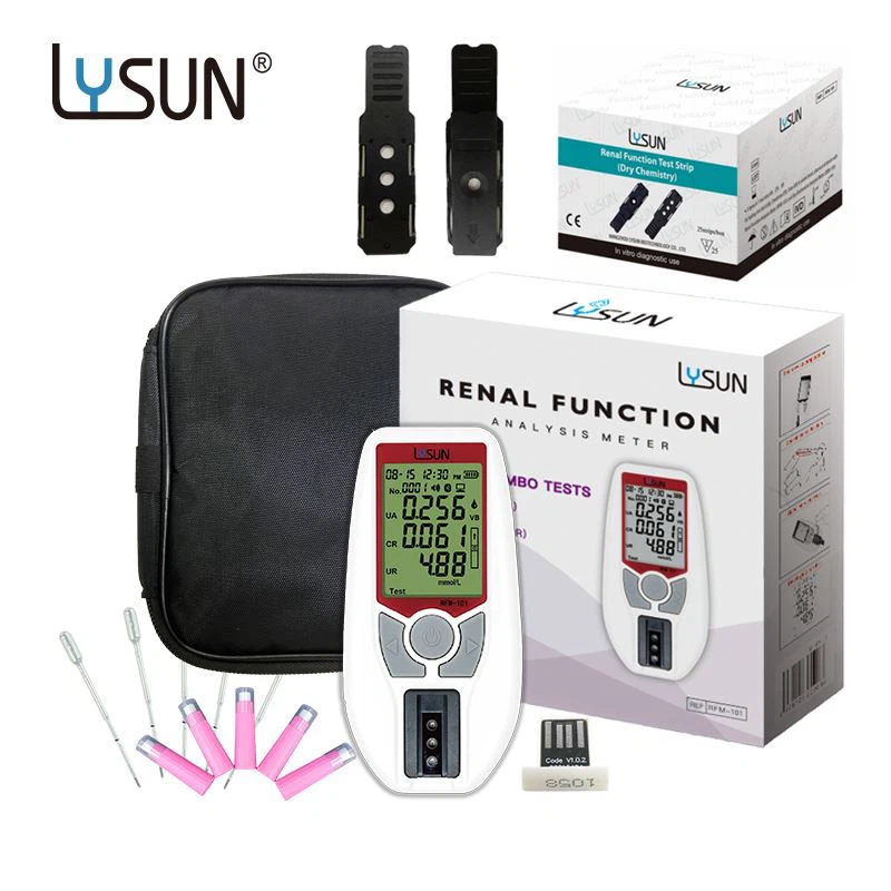 L'appareil d'analyse de la fonction rénale est destiné à la détermination quantitative de l'acide urique (UA), de la créatinine (CR) et de l'urée (UR) dans le sang capillaire, le sang total veineux, le plasma et le sérum. Le système facile à utiliser se compose d'un appareil de mesure portable qui analyse l'intensité et la couleur de la lumière réfléchie par la zone réactive d'une bandelette de test, garantissant des résultats rapides et précis.