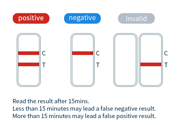 Positif (plus) : des bandes rouges apparaissent sur les lignes T et C en 15 à 30 minutes. Une bande blanche à